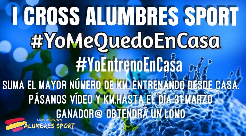 La directiva del Club os propone este reto I CROSS Alumbres Sport #YoMeQuedoEnCasa #YoEntrenoEnCasa, para ello quien quiera participar, se realizará un grupo de WhatsApp aparte, consistirá en acumular el mayor número de km. posibles hasta el día 31 de Marzo a las 00.00h. Tendreis que hacer captura de los días de entreno en una aplicación donde muestre KM y día, mandarla al grupo que se habilite, junto a un pequeño vídeo del entreno. Habrá premio para modalidad Bike y otro para Runners. (Cinta o rodillo, vale). Lomo para los ganadores de ambas categorías Bike y Running. ¡Animaos¡ #YoEntrenoEnCasa